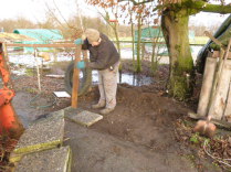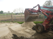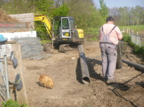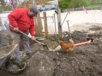 Der Run schien unaufhaltsam, hatten wir doch tatsächlich gestern den Ponyknast fertig. Heute dann das Finale, eigentlich, Eingangstor und ein Zusatzgulli einbauen. Nun ja, es wäre ja auch sehr unauthentisch gewesen, wenn nicht noch wenigstens zum Schluß dicker Regen und Hagel reingefunkt hätten! Hat die Sache erschwert, aber nicht gestoppt. Petrus? Pah, wer ist schon Petrus?!