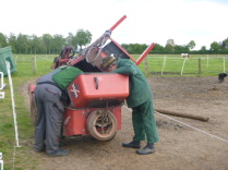 Die Leitung ist oben geblieben, ansonsten haben wir mal wieder ganz laut HIER geschrien! Wir waren wirklich gut vorbereitet und trotzdem hat´s uns wieder volle Breitseite erwischt. Besonders die Nacht war schlimm, panische Tiere, umherfliegende Dachpfannen, Utensilien und ganze Bauten ergriffen die Flucht über Nachbar´s frischgepflügten Acker Richtung Landstrasse. Wir kamen uns vor, wie in einem schlechten Endzeitfilm. Vieles ist kaputtgegangen und es ärgert uns extrem, daß wir unsere Planungen Richtung Fortschritt erstmal zu Gunsten von Reparaturen auf Eis legen müssen. Heute haben wir aufgeräumt, Bilanz gezogen und geplant, was-wie-wo-zuerst dran ist und versucht, geistig runterzufahren. Einziger Punkt, der alles verharmlost: es sind weder Tiere, noch Menschen ernsthaft zu Schaden gekommen! Was will man machen, der Klimawandel hat uns halt lieb und Kopf in den Sand stecken ist nicht! Geht ja auch gar nicht, ist ja grad nur Wasser da...