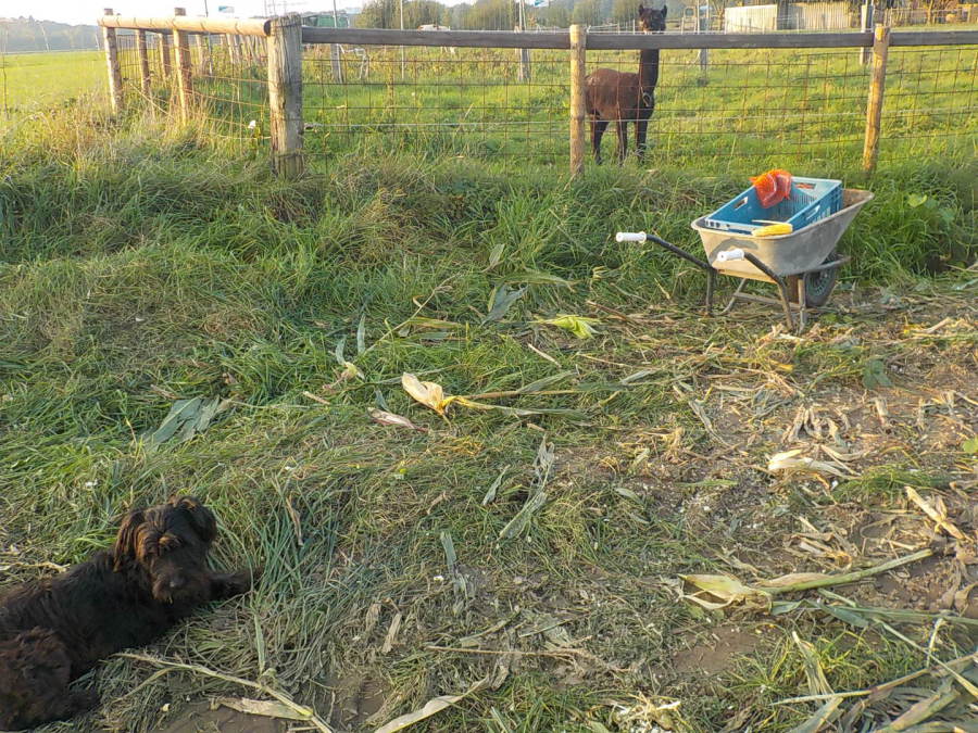 Wunderbares Wetter am Niederrhein! Erzeugt gute Laune, fördert den Fortschritt und macht Tiere und Menschen auf dem Hof happy. Wintervorbereitungen fühlen sich da echt widersinnig an, nützt aber leider nix. Aktuell grasen wir jede "freie" Minute die abgeernteten Maisfelder ab, Süssigkeiten für die Tiere sammeln. Macht Spaß und bringt Gesichtsfarbe, die haben wir bei Kälte ja nur bei Bluthochduck, oder beim Kaltbluthaufen schaufeln. Ob nun der obligatorische Dämpfer folgt, ist uns am heutigen Abend egal, die letzten Tage waren wir produktiv, sind gebräunt und haben Kraft getankt, dieses gute Gefühl lassen wir frühesten morgen wieder los...!