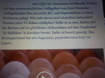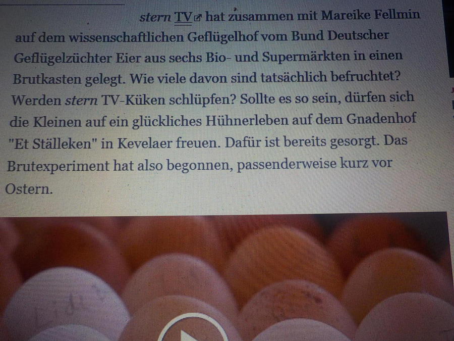 Wer mittwochsabends SternTV schaut, der weiß es schon: wir sind Eltern geworden! Ende März startete in der Sendung ein Experiment, ob Eier aus dem Supermarkt befruchtet sind. Einige waren es tatsächlich und nun sind die Küken geschlüpft und werden demnächst bei uns einziehen! Also mit Hühnerbabybrei und Mehlwürmchen bevorraten und die Stempelkinder herzlich willkommen heissen! Für unser Katerchen sieht es leider nicht so gut aus, er wird gerade auf Medikamente eingestellt und in 3 Wochen sehen wir weiter. Extrem schwer zu fassen, denn er ist tippitoppifit dabei! Ansonsten steht grad alles auf grün hier, Weiden nachschauen und aufpimpen, die Großtiere anweiden, Grünzeug für die Kleintiere anpflanzen usw, usw...