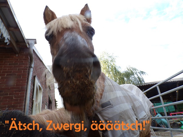 Ganz schön gefährliches Pflaster hier! Diesertage ist Zwergi vor einen LKW gelaufen. Die Gnadenhofrettungschefin ist dann auch sofort losgerannt, aber nicht, um erste Hilfe zu leisten -geschah nämlich auf der Standspur-sondern um die Konsumentenrechte zu klären. Tja, da kam beim Eintuppern aber das blaue Wunder. Sie ist dann erstmal beleidigt mit den Kindern zur Frittenbude abgezogen, aber da war es so voll, an der Theke standen welche und die Salatbar war auch besetzt. Also hat sie sich doch wieder als Erste an den Tüten bedient und selbst was Gutes gekocht, tze ;-) ! Am nächsten Tag ist das Zwergi dann vor einen Bus gerannt, Glück gehabt, war auf dem Parkstreifen. Lauter nützliche Sachen und da Zwergi grad kein Auto hat und der Sprit ohnehin teuer ist, war das Highlight ein ganz toller Drahtesel. Am Montag ging die Unfallserie direkt weiter, vor eine Kiste im Eingang gerannt, ja wer hat die denn da wohl hingestellt?! Drin waren ganz viele Dosen Bodri´s Best, oh, wie hat er sich gefreut! Er braucht das Powerpäppchenfutter wirklich ganz dringend! VIELEN DANK, liebe Unfallverursacher :-) !!! Die Spenden für Ungarn sind unfallfrei und ruck-zuck am Ziel angekommen, dort war die Freude auch wieder riesig und an alle Spender sollen wir ein herzliches "Köszönöm szépen!!!" ausrichten! Die beiden letzten Tage sollen ja die letzten, schönen gewesen sein, also haben wir sie alle richtig ausgenutzt, die Stalltiere haben die Sonne nochmal so richtig genossen, die Hausfaulis mussten zum Seniornsport, das macht Spaß und auch müde. Jetzt ist es biestig kalt, also auf die Mützen, fertig, los...
